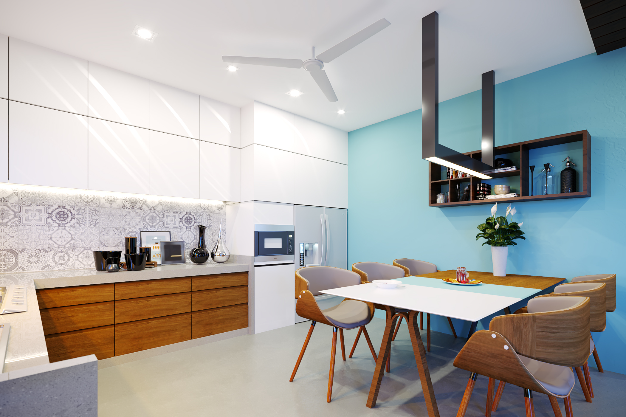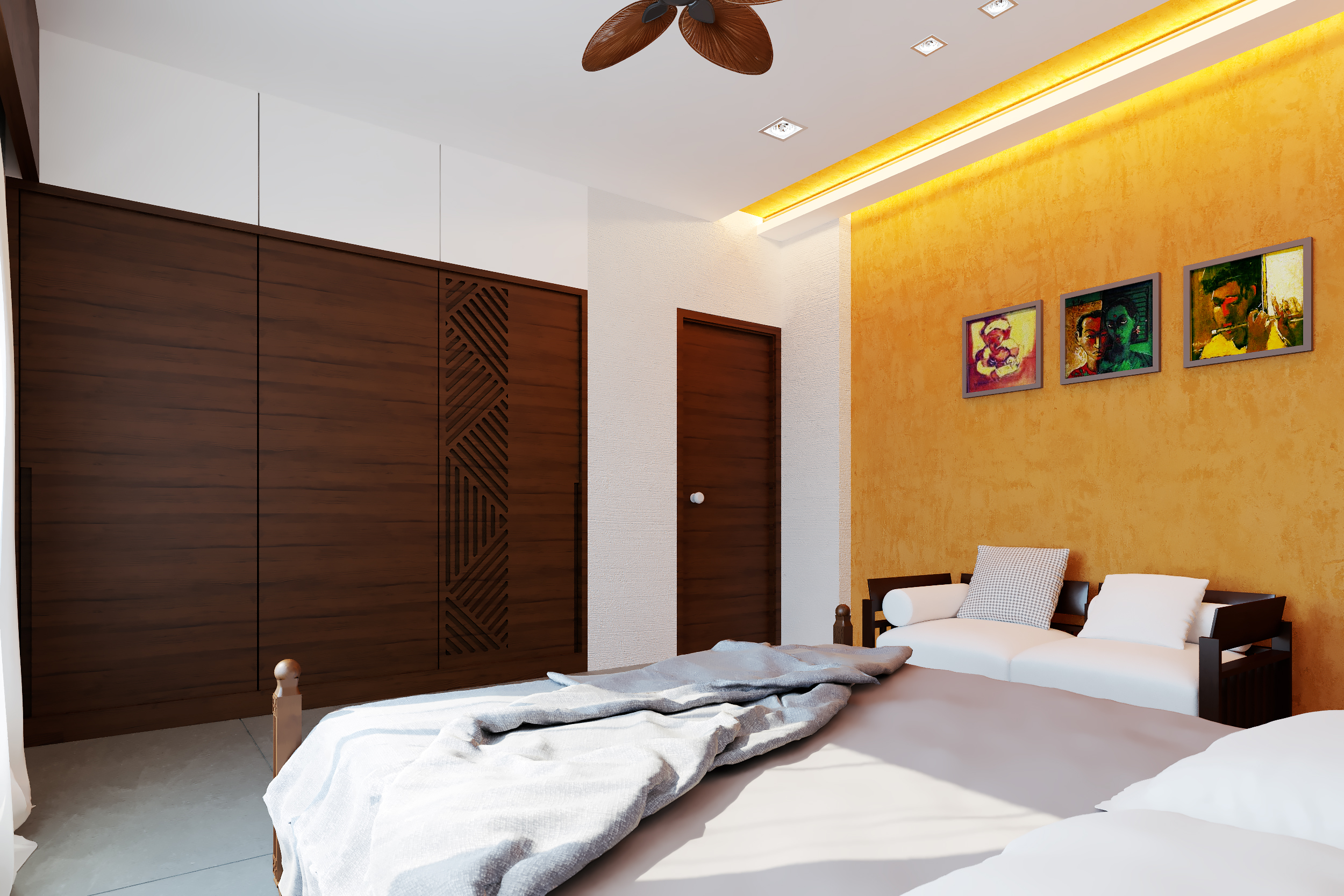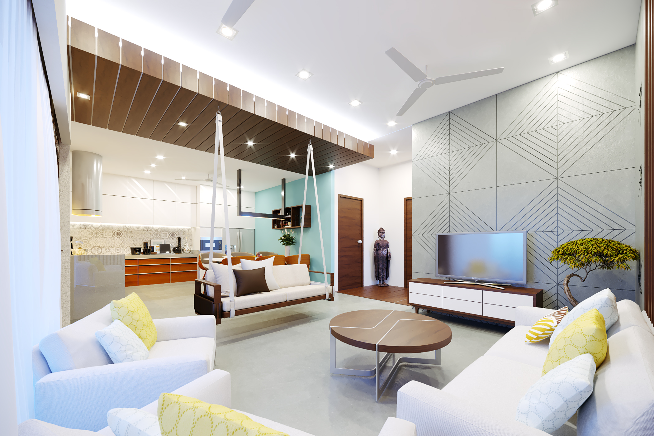 The idea here was to use bright tones of colors for the overall theme of the interiors due to compact spaces while accentuating the furniture with a dark wood polish balancing it with the interiors space. Featuring a colored/texture painted wall in every space defines the significance and uniqueness of each space while seemingly blending it with the interior color theme.