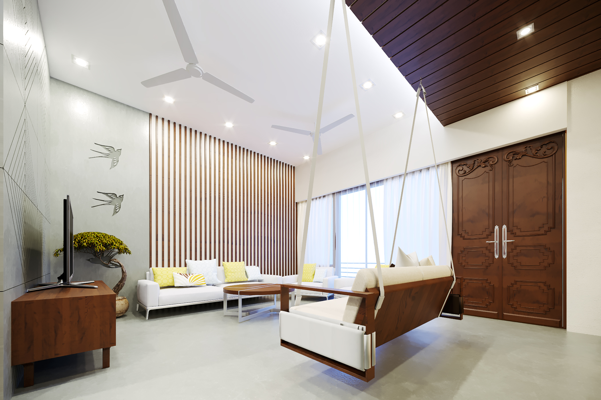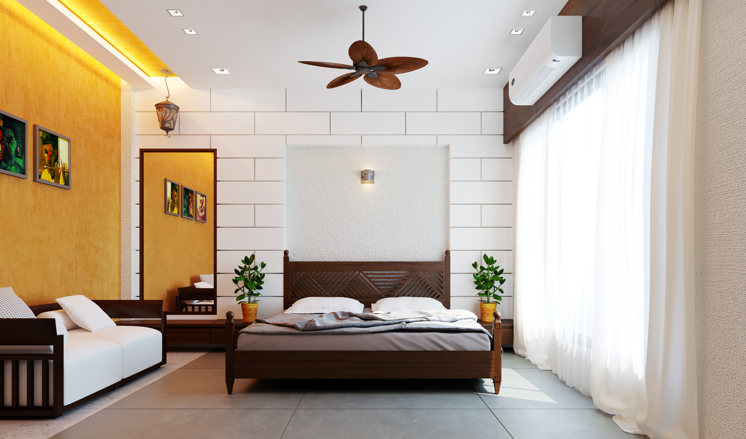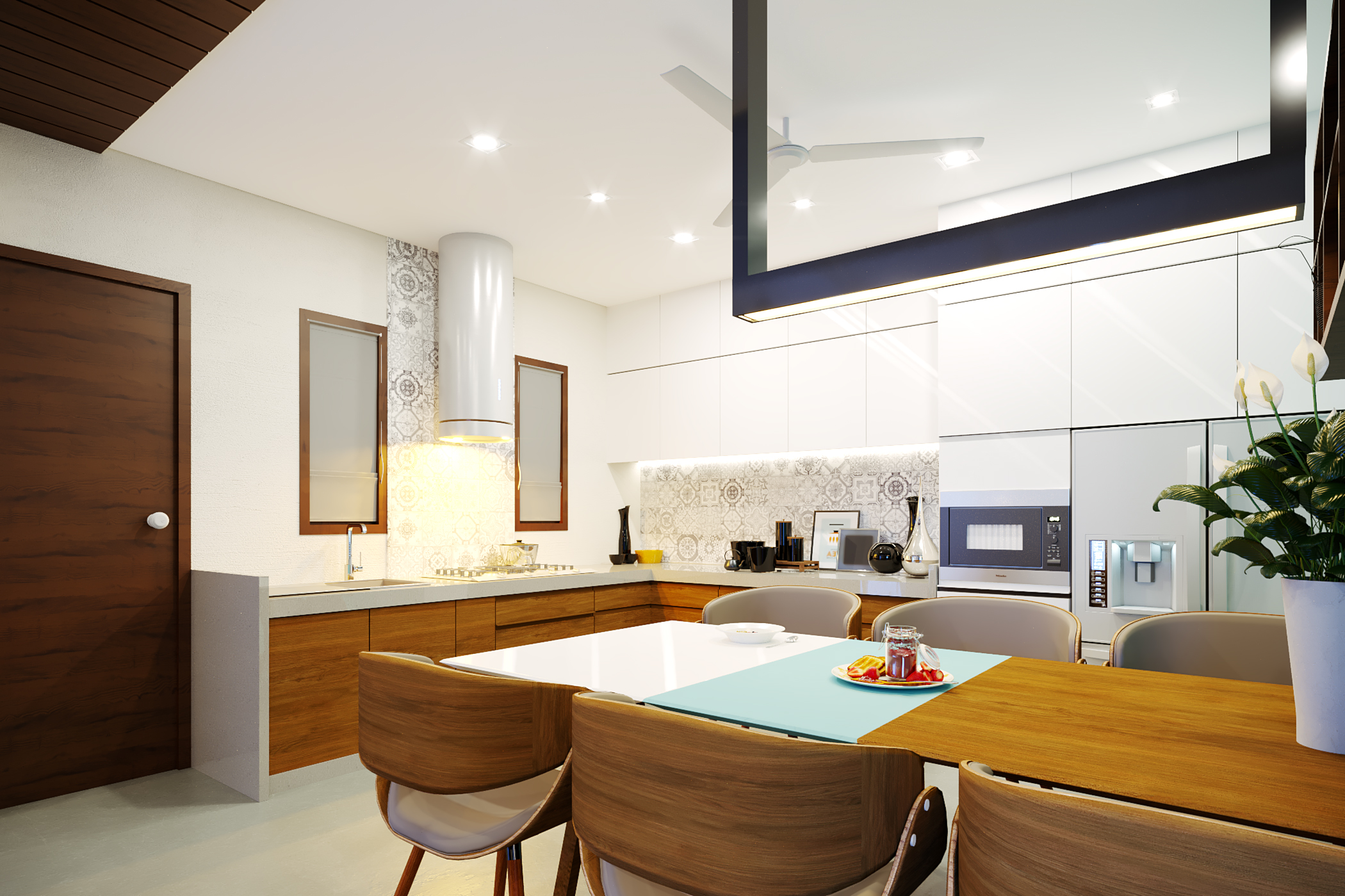The idea here was to use bright tones of colors for the overall theme of the interiors due to compact spaces while accentuating the furniture with a dark wood polish balancing it with the interiors space. Featuring a colored/texture painted wall in every space defines the significance and uniqueness of each space while seemingly blending it with the interior color theme.