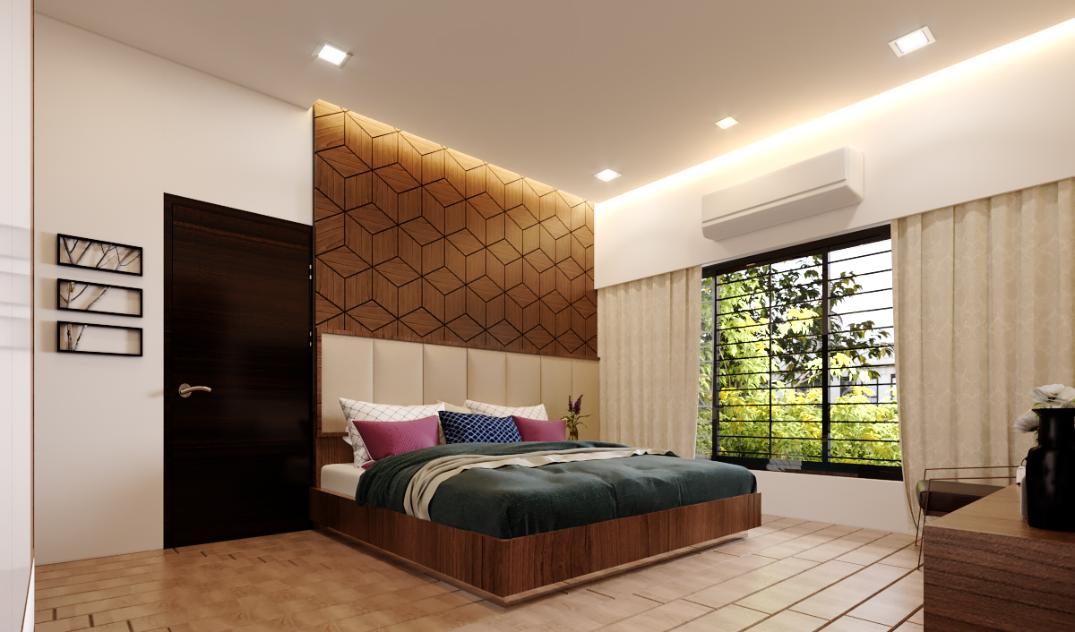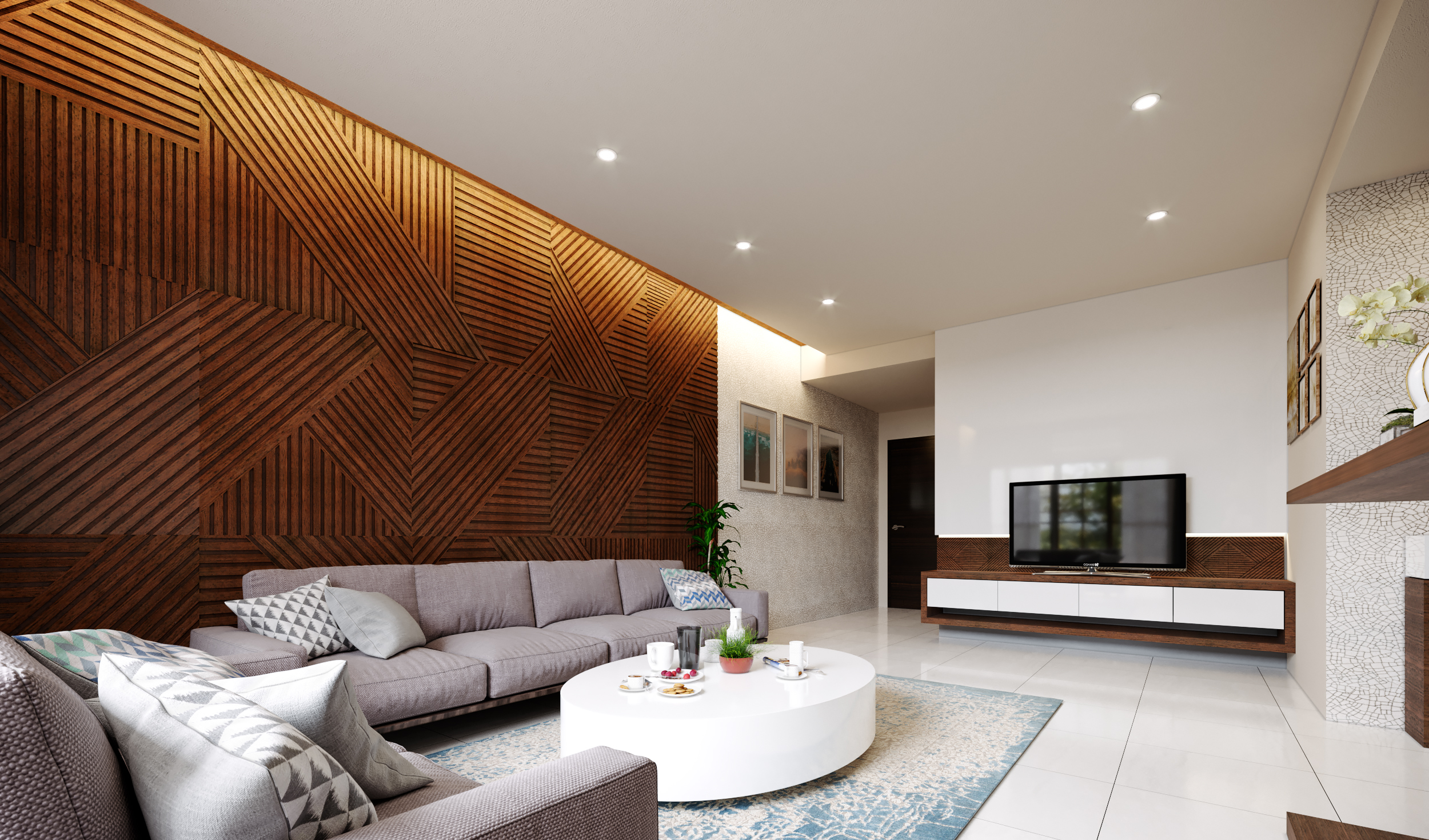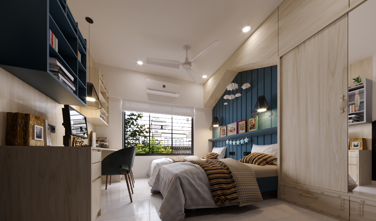 The living room is designed in simples lines while highlighting the walls with wooden panelling and a display unit filled with artifacts on the other side. The metal jali partition cuts the direct vision from the living room into the dining space. The master bedroom is designed in a color palette of white and brown with a highlighting bed back design.The kids bedroom has a two seperate beds designed with a blue finished bed back ith a small ledge space. The wall opposite to the bed is treated with a linear study table with two library units for the two kids.